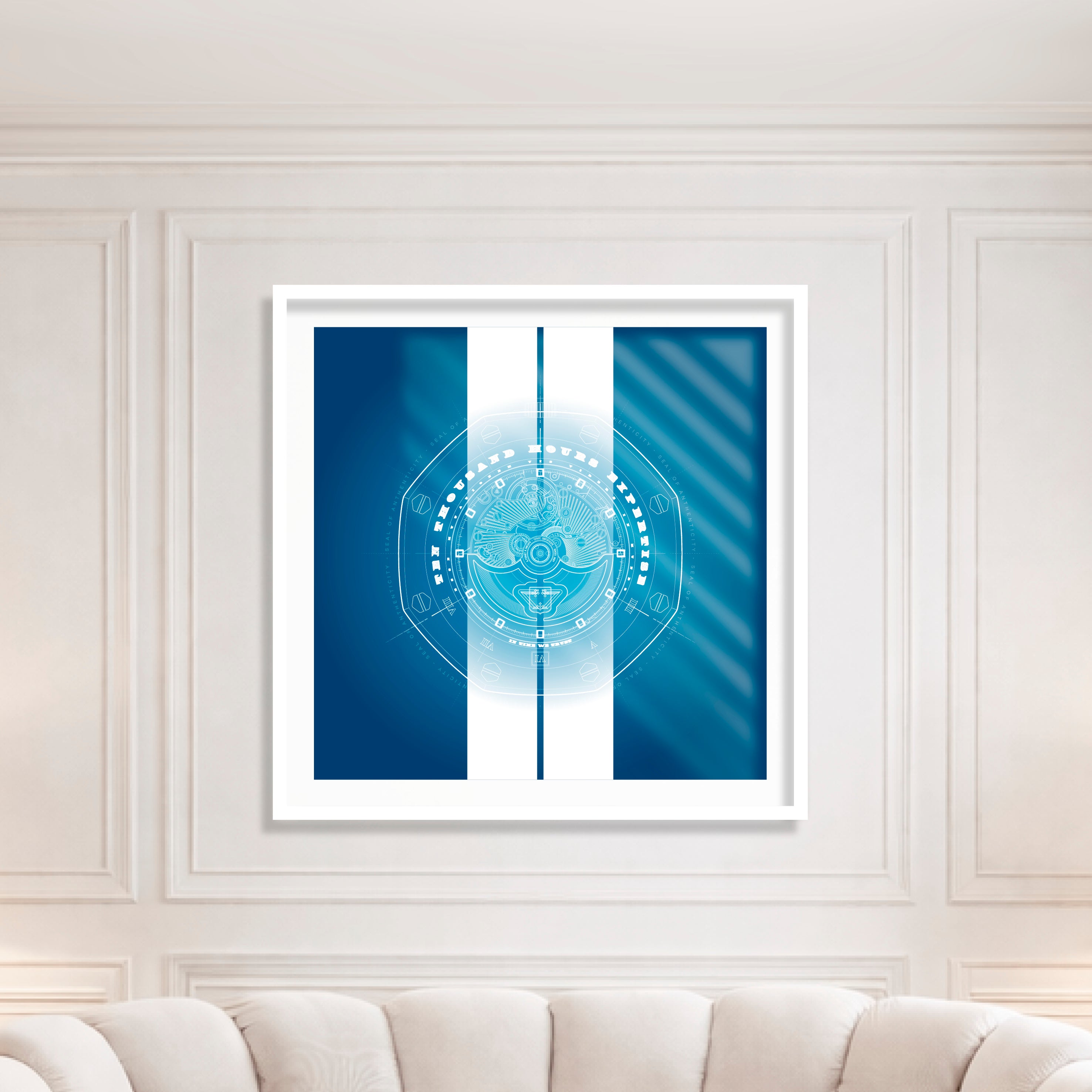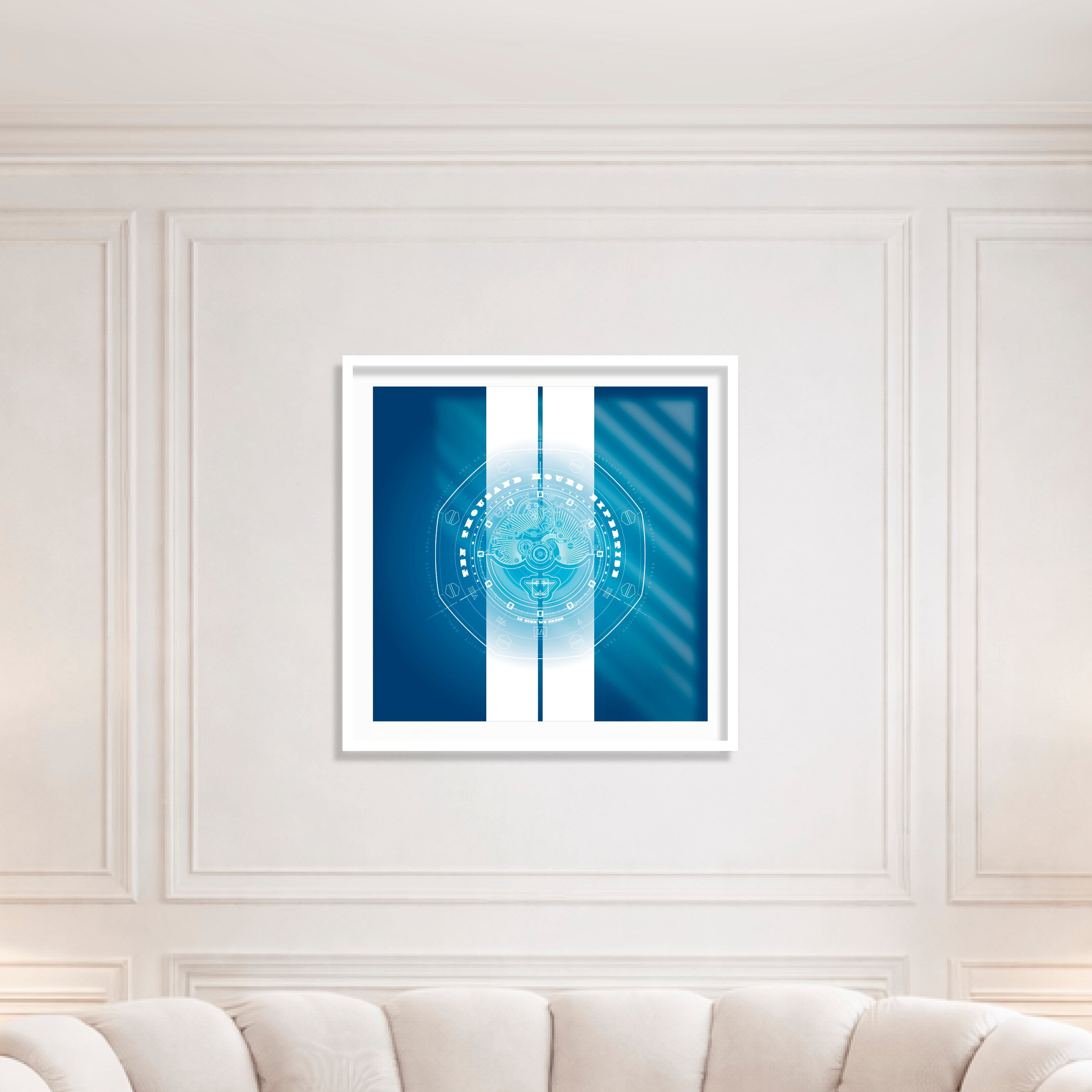 The palette explores the depth of blue and the precision of white.
